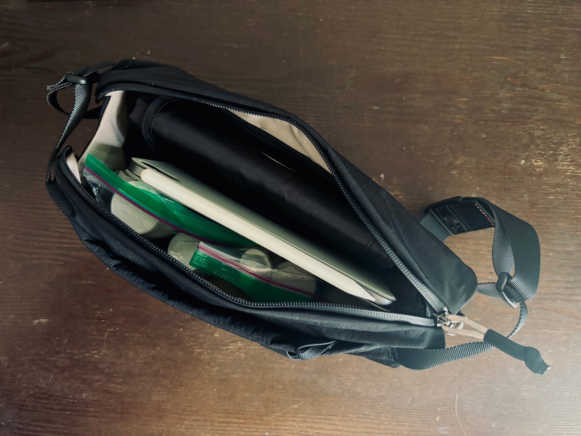 I’ve had my eye on sling bags for a few years. I’ve been mostly a backpack guy, especially for work. I didn’t always like the locker system at my job, and just having a backpack with the things I want with me was a nice thing to have. Things I’d carry with me would include a laptop or larger iPad, chargers, cables, keys, medications, and a drink container or two.