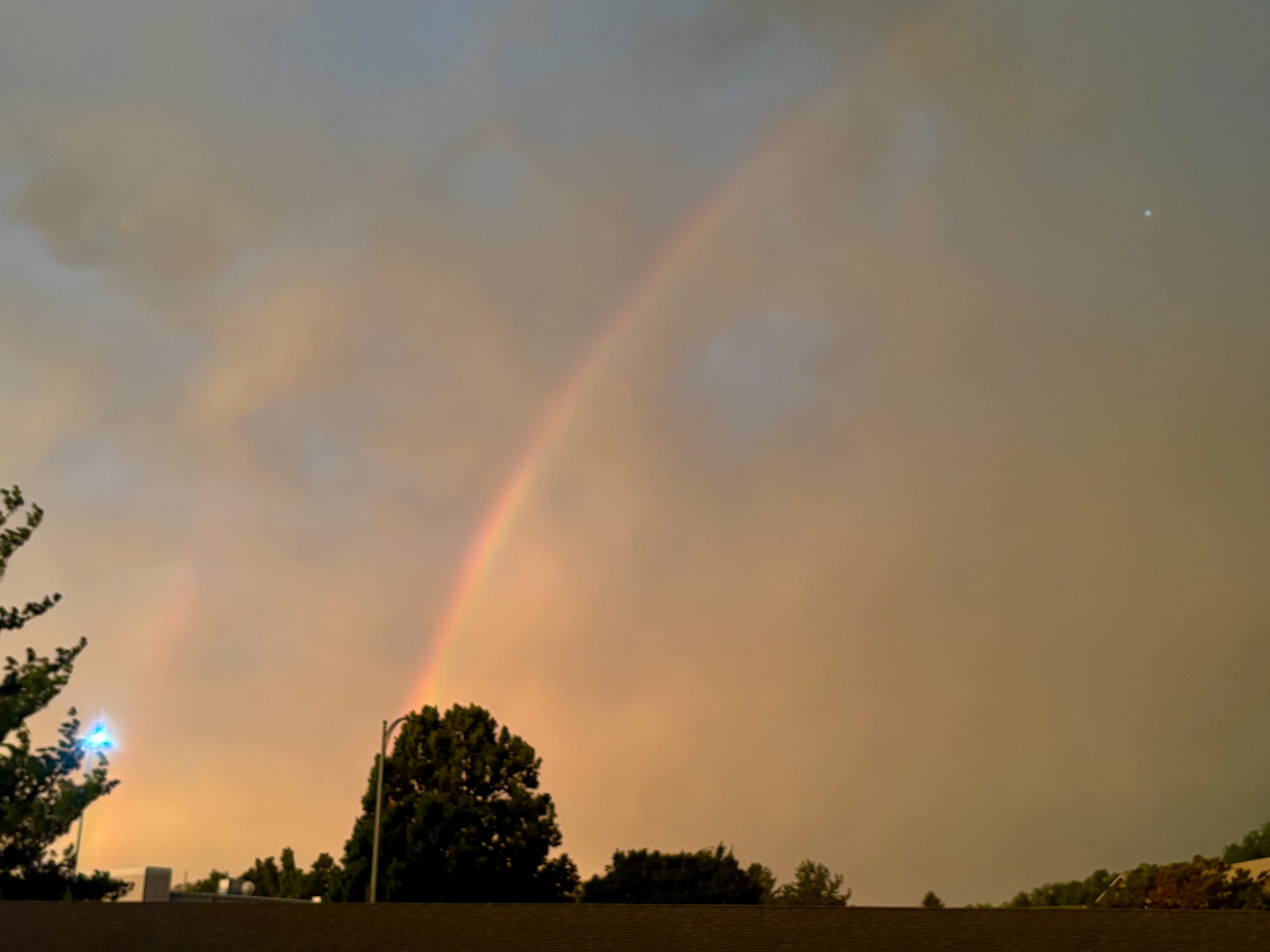 On the surface this is just a rainbow. I was woken up by a severe thunderstorm warning on my watch at 5 AM. There was word of a storm incoming, bringing potential 80 mph winds with it. I got up, brought my chairs in off my balcony, and then watched the storm. Luckily the winds weren’t as inbound to my apartment as I thought they could be. This photo was snapped while nearby tornado sirens wailed around me warning of the high winds. It was kinda surreal.
