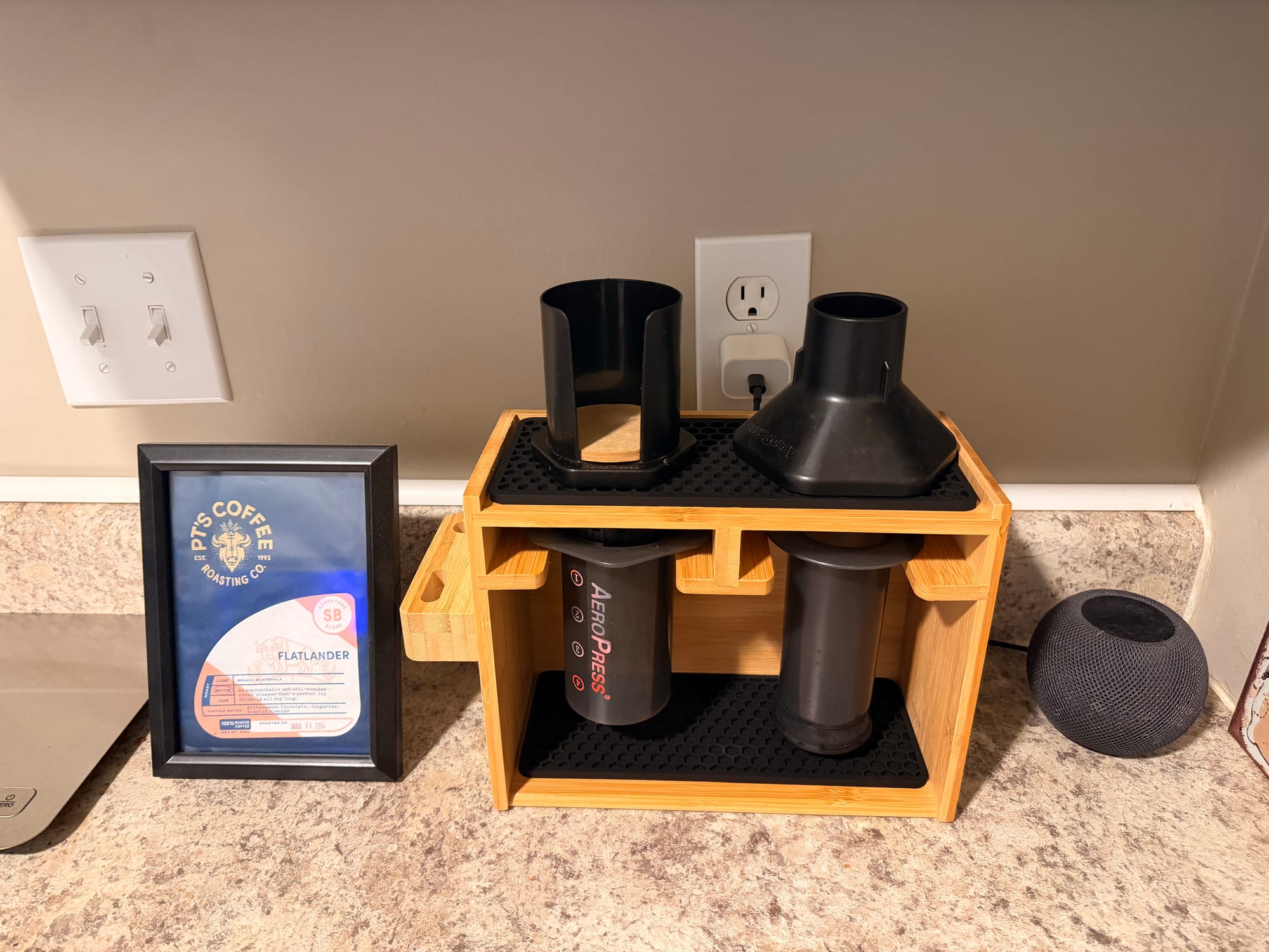 I organized my coffee space this past week. Instead of traveling back and forth across the kitchen for everything, I can now stand in one spot and have everything I need: coffee (or tea), my Aeropress, and all my cups. I don’t know why it took me a year to figure this out.